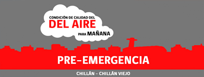 De acuerdo al Decreto Nº 48 de fecha de 28/10/2015 del Ministerio del Medio Ambiente, que establece Plan de Prevención y Descontaminación Atmosférica para las comunas de Chillán, Chillán Viejo, tomado en Razón con Alcance el 14/03/2016 por la Contraloría General de la Republica , y considerando los antecedentes técnicos de la Secretaría Regional Ministerial de Medio Ambiente de la Región del Biobío, se declara condición dePreemergencia para el día 26/07/2017, en las comunas de Chillán, Chillán Viejo.